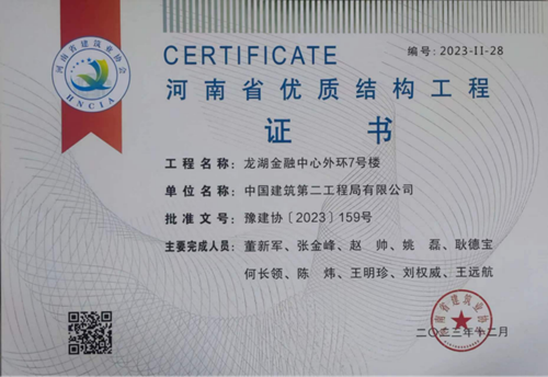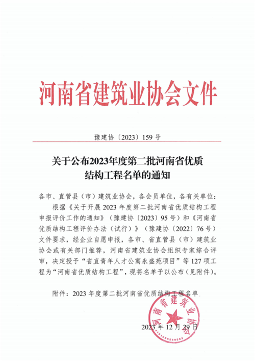 近日,河南省建筑業(yè)協(xié)會(huì)發(fā)布《關(guān)于公布2023年度第二批河南省優(yōu)質(zhì)結(jié)構(gòu)工程名單的通知》(豫建協(xié)〔2023〕159號(hào)),城發(fā)·金岱智慧產(chǎn)業(yè)園二期和龍湖金融中心外環(huán)7號(hào)樓兩項(xiàng)工程順利通過專家組考評,榮獲“2023年度河南省優(yōu)質(zhì)結(jié)構(gòu)工程”獎(jiǎng)。