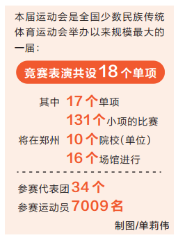 據(jù)競賽表演部相關(guān)負(fù)責(zé)人介紹,本屆民族運動會競賽表演共設(shè)18個單項,馬上項目比賽已于7月12日至17日在呼和浩特圓滿結(jié)束,其他17個單項,131個小項的比賽將在鄭州10個院校(單位)、16個場館進(jìn)行;參賽代表團34個,參賽運動員7009名,是全國少數(shù)民族傳統(tǒng)體育運動會舉辦以來規(guī)模最大的一屆。另外,本屆運動會還將突出河南省武術(shù)大省的優(yōu)勢,“少林拳”和“陳氏太極拳”等也將一一呈現(xiàn)。