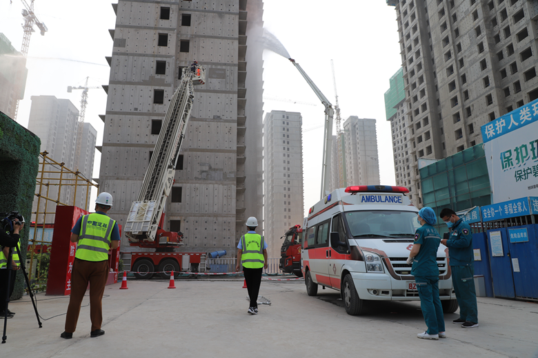 啟動(dòng)儀式上,在工地現(xiàn)場(chǎng)開(kāi)展了消防救援應(yīng)急演練。該環(huán)節(jié)模擬施工現(xiàn)場(chǎng)發(fā)生火災(zāi)時(shí),現(xiàn)場(chǎng)管理人員應(yīng)急操作反應(yīng)及配合市消防救援支隊(duì)展開(kāi)滅火救援的案例。演練現(xiàn)場(chǎng)火災(zāi)模擬真實(shí)生動(dòng),4部消防車、1部救援車、1部救護(hù)車實(shí)地奔赴現(xiàn)場(chǎng)開(kāi)展滅火及救援。整個(gè)演練過(guò)程現(xiàn)場(chǎng)組織嚴(yán)密、人員到位快速、操作程序得當(dāng),達(dá)到了預(yù)期效果。宣誓環(huán)節(jié),由中建二局三公司代表引領(lǐng)各參賽單位代表共同開(kāi)展安全宣誓。趙新中為各參賽單位授旗。
